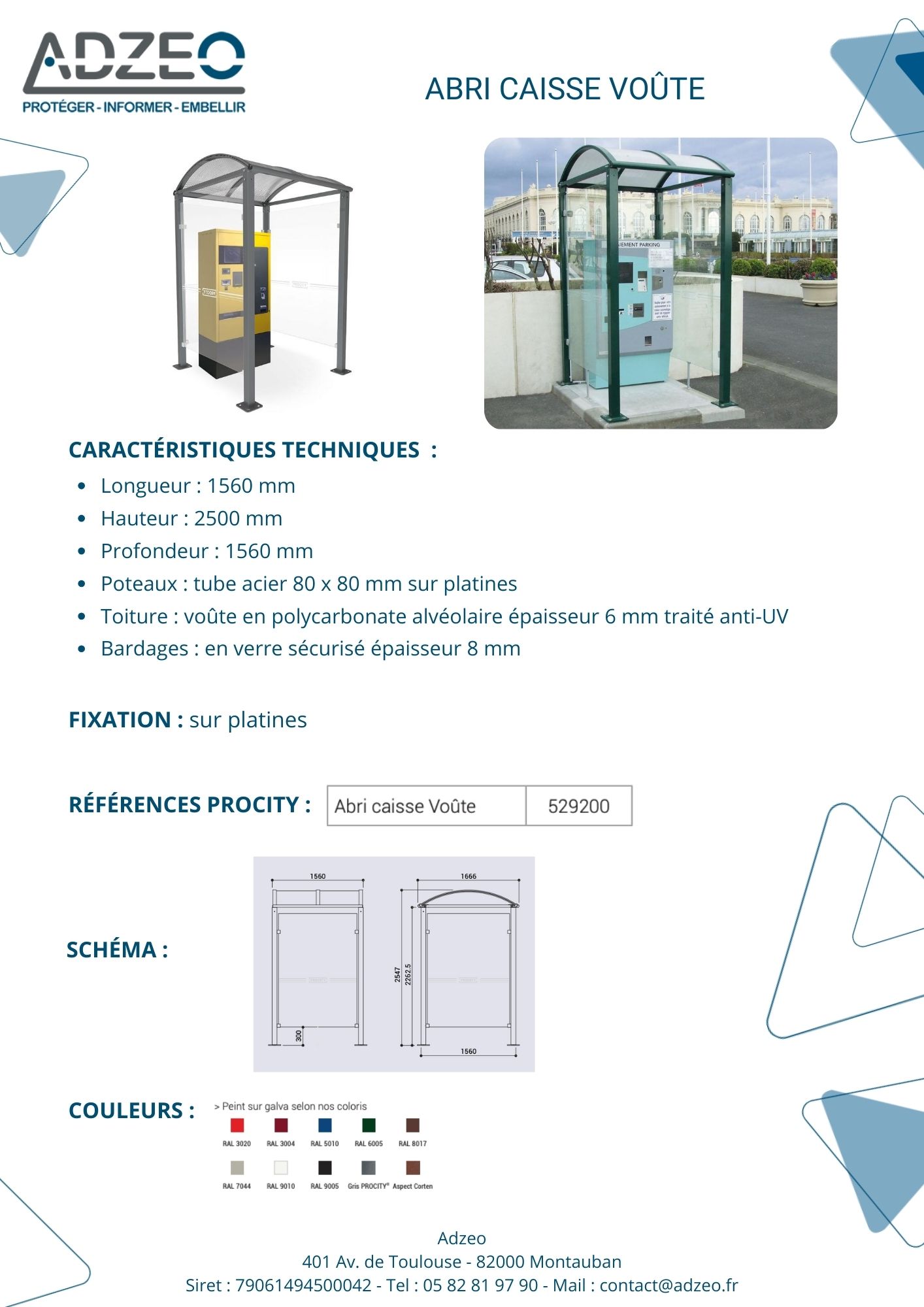 L’abri caisse Voûte, conçu par Procity, allie design et fonctionnalité, pour offrir un confort optimal aux usagers tout en les protégeant des intempéries. Avec sa forme voûtée, il apporte un charme instantané à votre espace. Idéal dans un parking, cet abri saura répondre à vos besoins spécifiques et vos espaces.