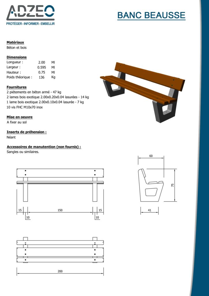 Notre banc Beausse, dispose d’une structure avec deux pieds en béton armé. L’assise et le dossier sont composés de lattes en bois exotique. Il ne demande aucun entretien, car il est protégé contre les intempéries et l’humidité.