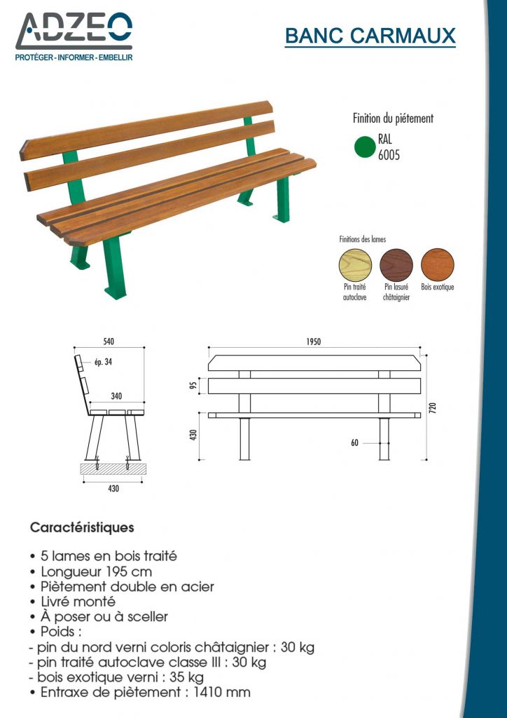 Ce banc en pin, est composé de 5 lames en bois traités pour résister à tous types d’intempéries. Nous vous proposons trois types de bois différents : pin verni, pin autoclave ou bois exotique verni. Le banc Carmaux possède un double piétement en acier pour plus de solidité.