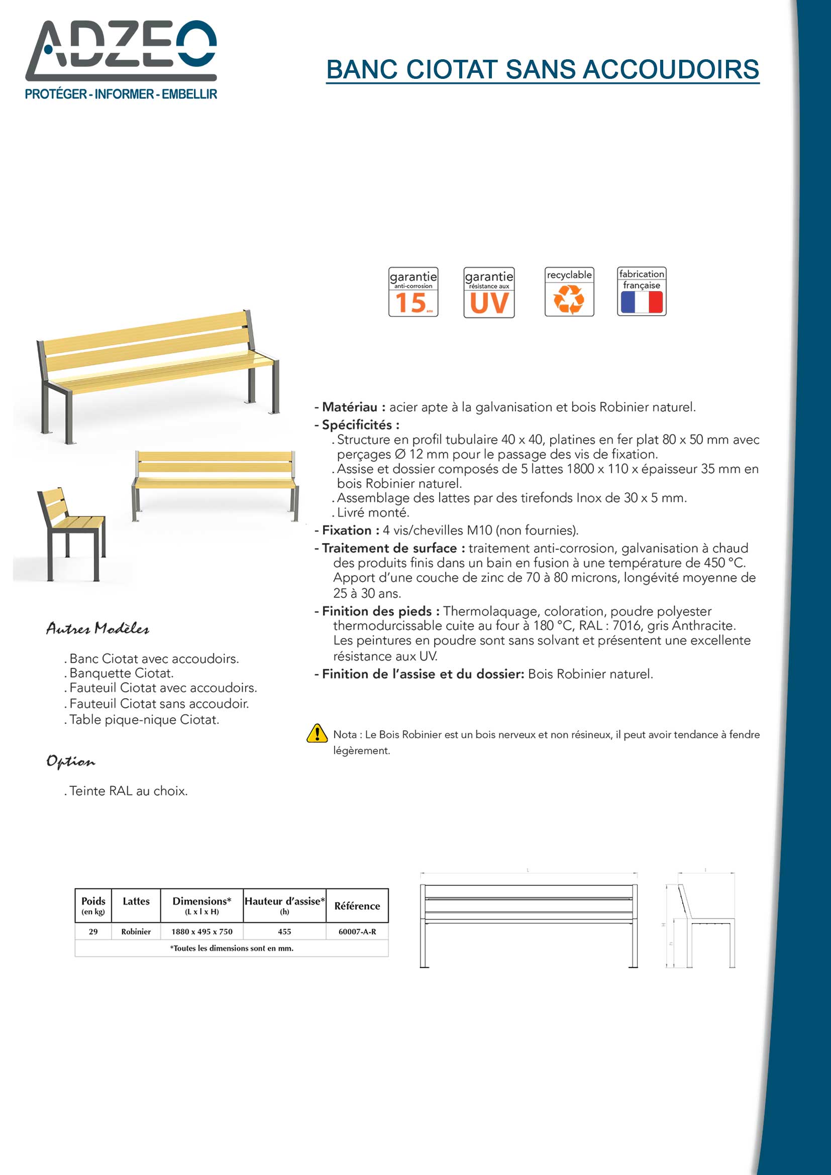 - Assise et dossier composés de 5 lattes 1800 x 110 x 35 mm en bois Robinier naturel.