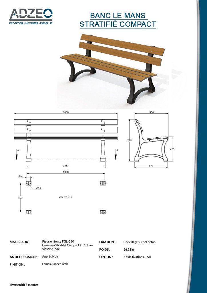 Ce banc Le Mans en stratifié compact, se compose d’une structure en fonte (anticorrosion), l’assise et le dossier sont en en stratifié compact (ép.18 mm). Fabriqués à base de feuilles de papier kraft compressées à haute densité, le stratifié compact est le matériau d’excellence pour associer durabilité, absence d’entretien, esthétisme et aspects environnementaux.