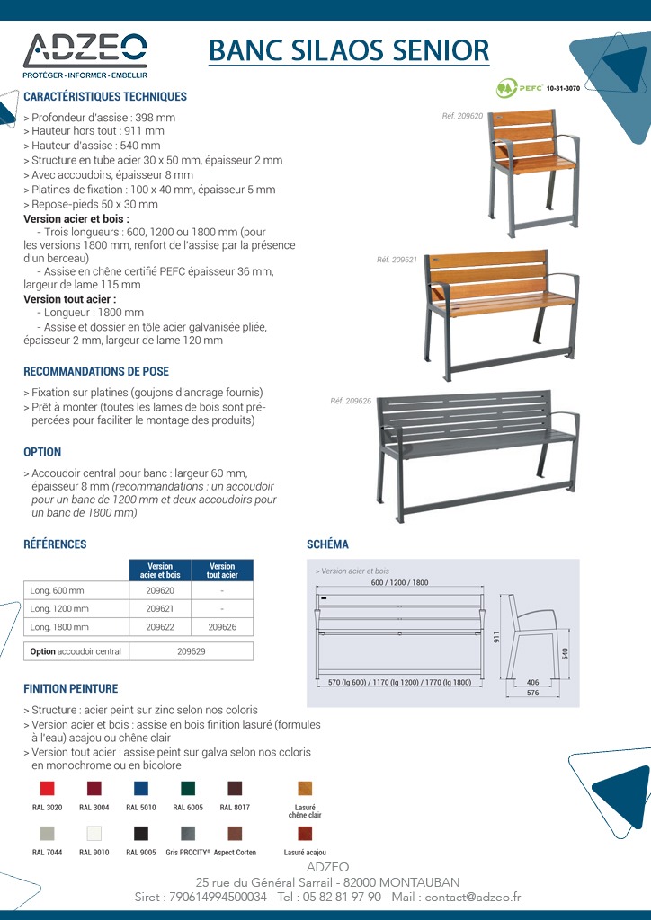 Le banc Silaos Senior est spécialement conçu pour le confort et la sécurité des personnes âgées. Grâce à sa rehausse d’assise, ses accoudoirs ergonomiques, son repose-pieds intégré et sa profondeur généreuse, il offre une aide appréciée par les seniors pour se lever et s’asseoir. Structure robuste en acier peint sur zinc, assise et dossier en chêne certifié PEFC, fabrication française.