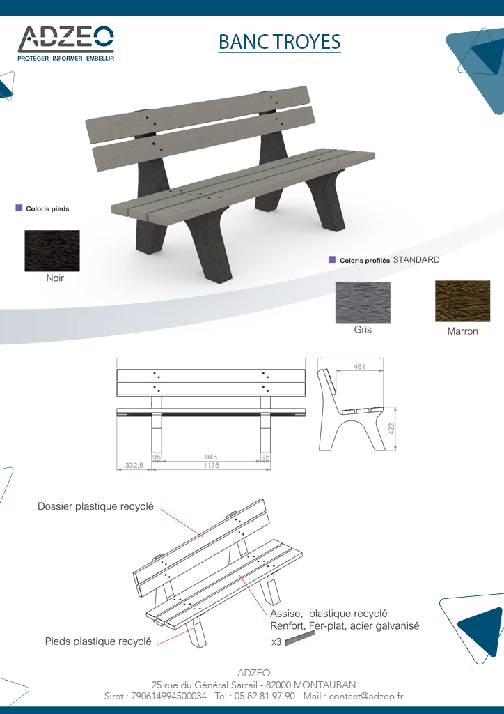 Le banc Troyes est un banc écologique réalisé exclusivement en matériaux recyclés teinté dans la masse et traité anti-UV. Confectionné dans le but d’obtenir un confort maximum.