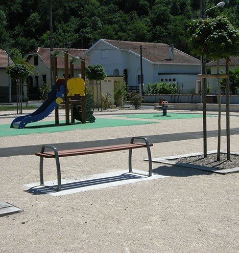 Banc Cassin en acier et bois sans dossier. Un classique pour moderniser et designer vos extérieurs et l’aménagement de vos espaces publics comme vos parcs, jardins publics, rues, cours…