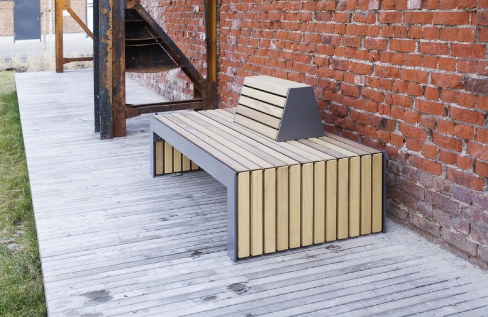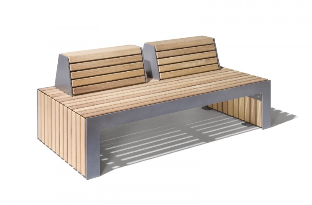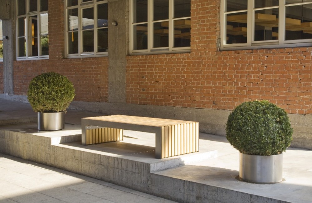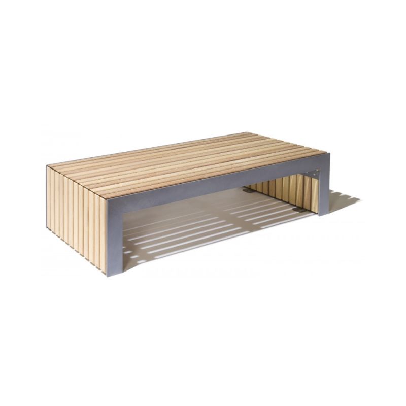La banquette Plaza M se compose d’une structure en tôle d’acier galvanisé d’épaisseur 10mm et d’une finition peinte d’un gris métallisé équivalent au RAL 7016 (DB 703). L’assise est en bois dur FSC non traité et est conçu pour résister dans le temps.