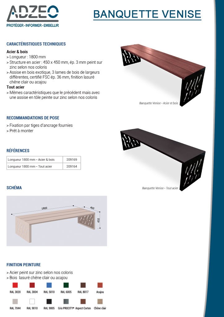 Cette banquette Venise tout acier dispose d’une structure en tôle d’acier avec une épaisseur de 3 mm ainsi qu’une hauteur et une largueur de 450 mm. Cet acier est peint sur zinc selon nos RAL standard.