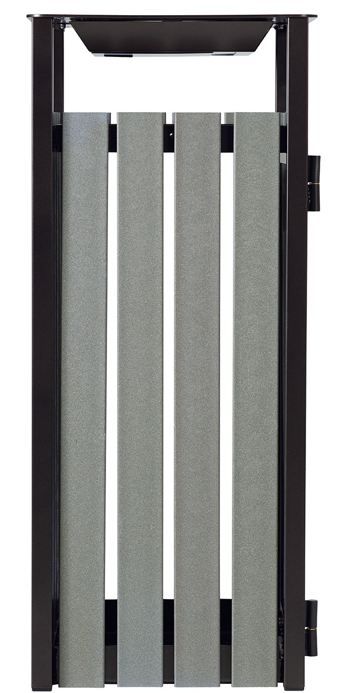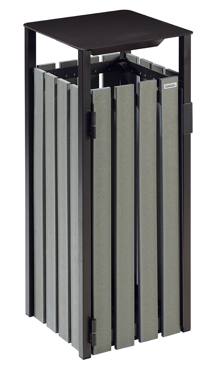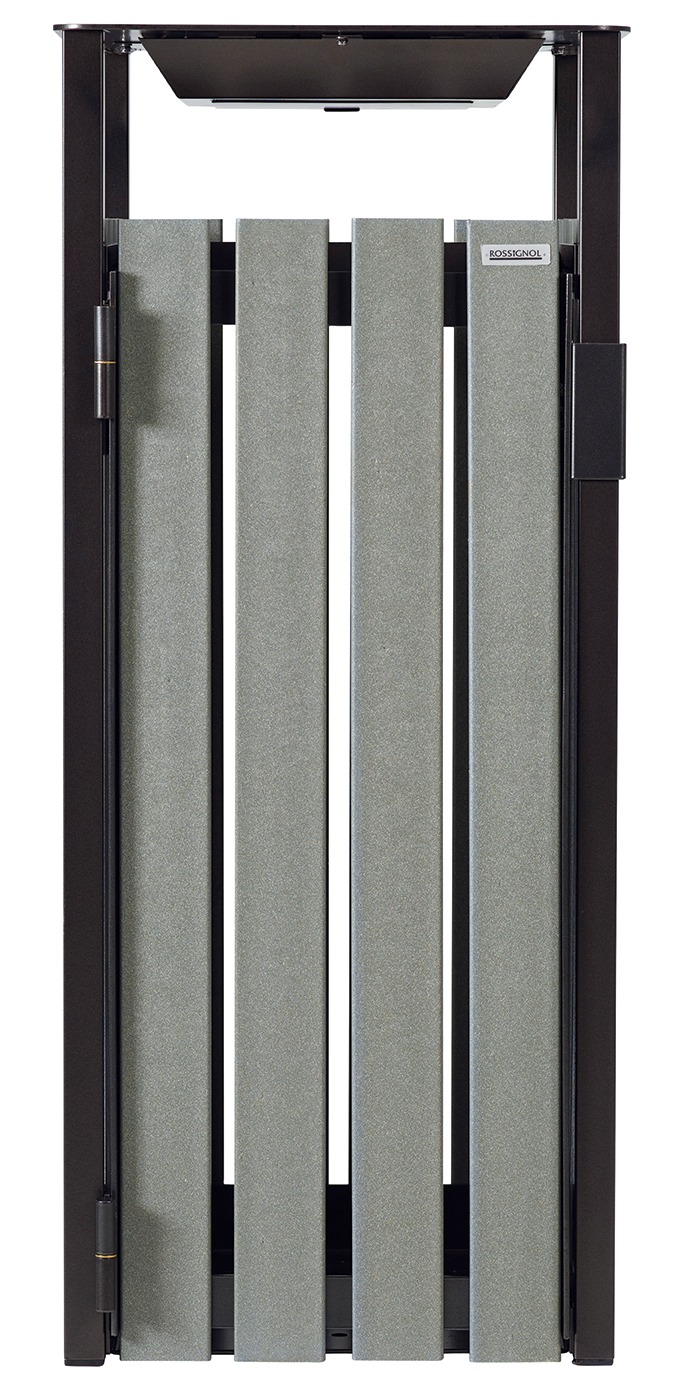 Poubelle de rue en lattes à base de briques alimentaires recyclées : un produit 100 % recyclé et recyclable.