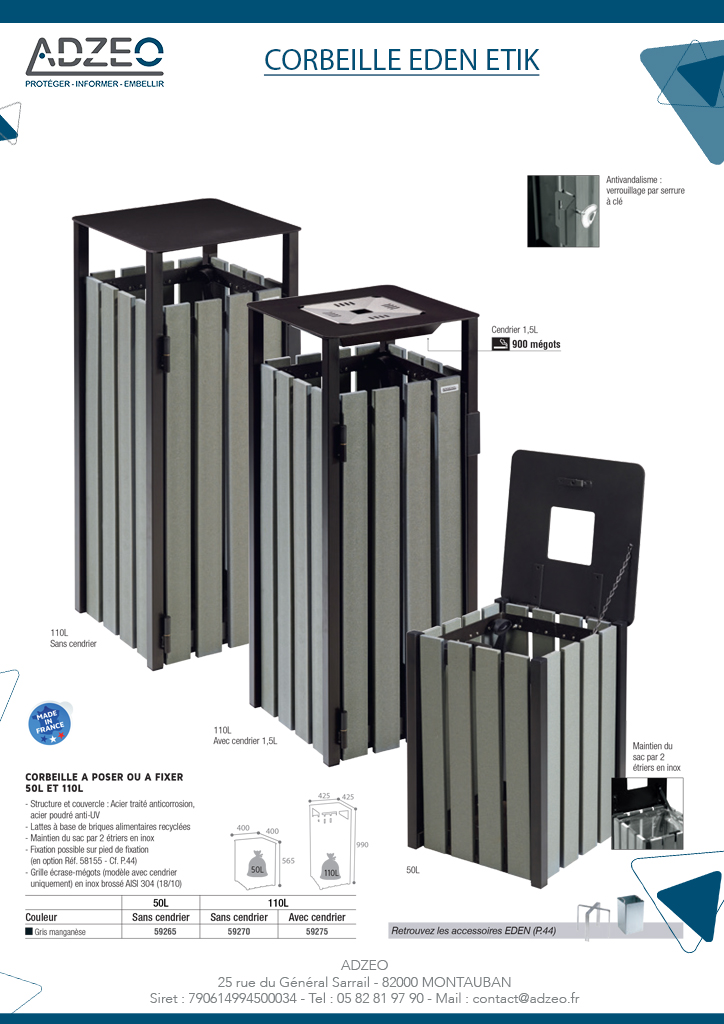 La corbeille Eden Etik est disponible en 2 litrages : 50 litres ou 110 litres avec ou sans cendrier. (Cendrier 1,5 L = 900 mégots)