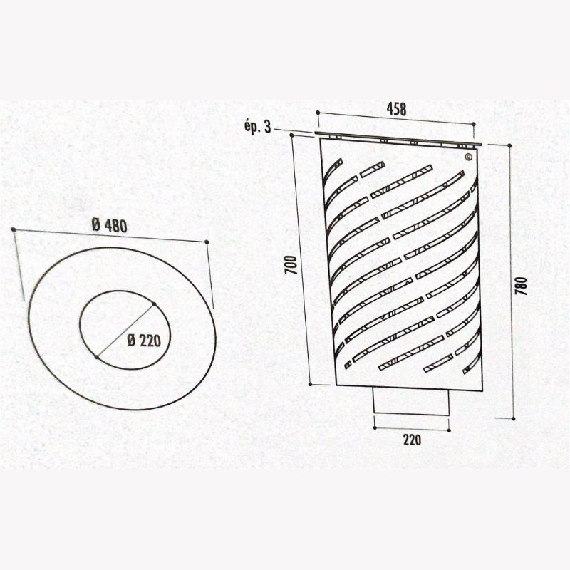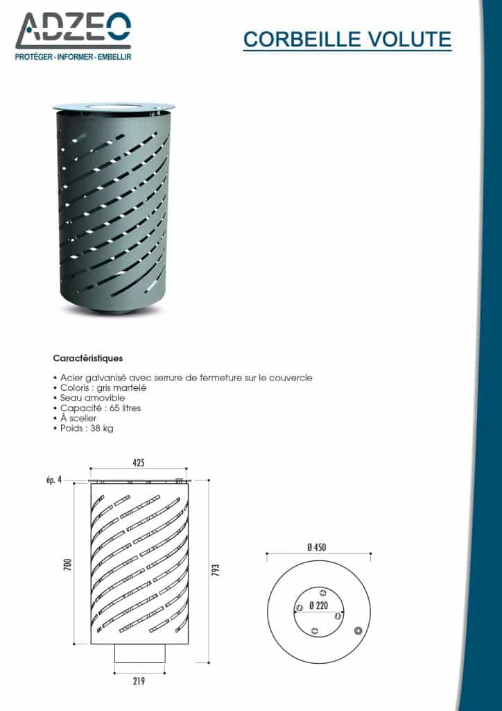 La poubelle urbaine Volute est en acier galvanisé avec une serrure de fermeture sur le couvercle. De plus le seau est amovible et possède une capacité de 65 litres. Enfin la corbeille Volute est en finition gris martelé.