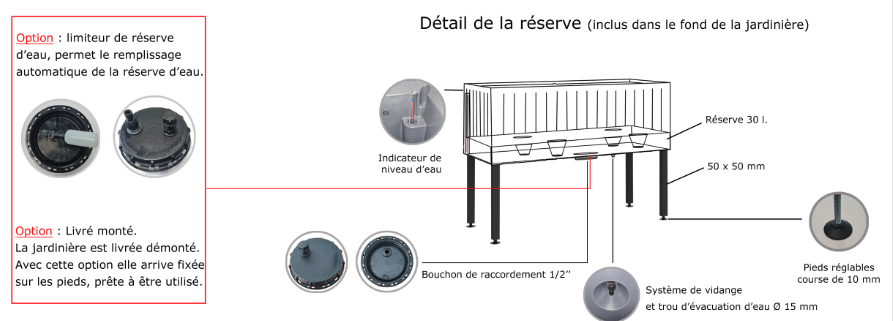 R : Réserve d’environ 30 litres intégrée, avec jauge de niveau et bouchon de vidange : elle permet d’optimiser l’arrosage, réduire l’entretien et garantir une meilleure croissance des plantations.