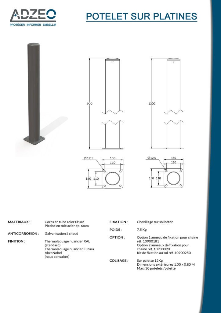Ce potelet carrefour sur platine est entièrement réalisé en acier galvanisé peint selon les 9 RAL standard. Le principe de la galvanisation est de procéder à un recouvrement par immersion de la pièce traitée dans un bain de zinc (450°C) qui pénètre et s’allie à l’acier de base, pour une protection accrue contre la corrosion. Les avantages liés à l’acier galvanisé à chaud sont nombreux, il résiste dans le temps (30 ans sans entretien), aux intempéries, aux chocs…