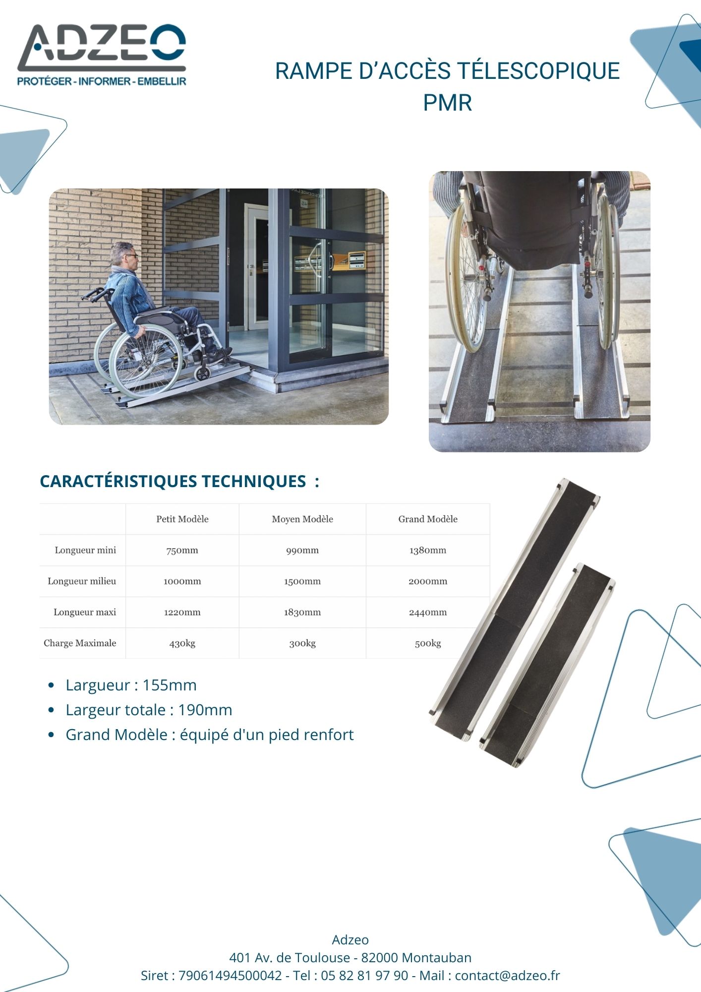 La rampe d’accès télescopique PMR se vend par paire et possède trois modèles : petit, moyen et grand. Les trois modèles de paire de rampe ont chacune trois positions différentes afin de s’adapter au mieux à vos besoins et aux marches de vos espaces. Elle sécurise le passage de vos usagers en situation de handicap ou dans le besoin.