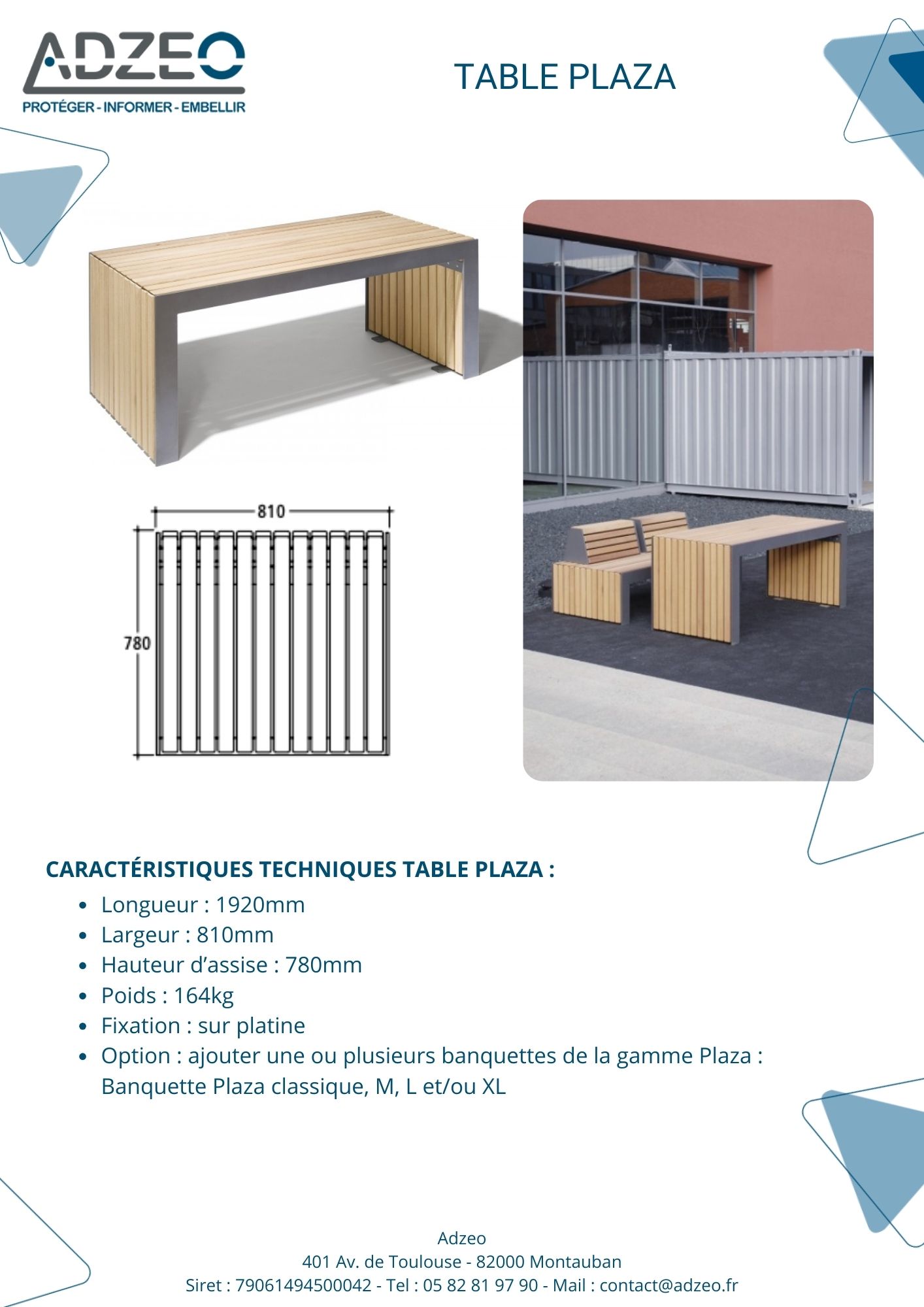 La table Plaza apporte élégance et modernité à votre espace. Elle saura sublimer et apporter la touche finale à votre environnement. Amusez vous à composer vos espaces urbains de façon originale et unique grâce à la gamme Plaza.
