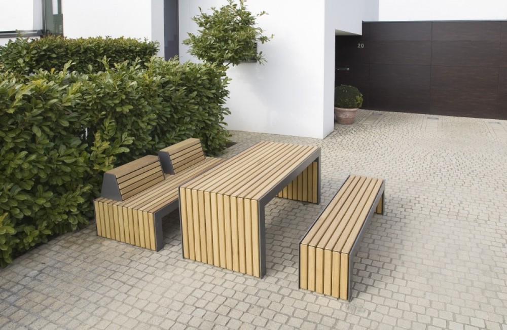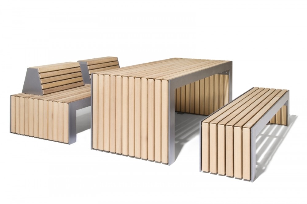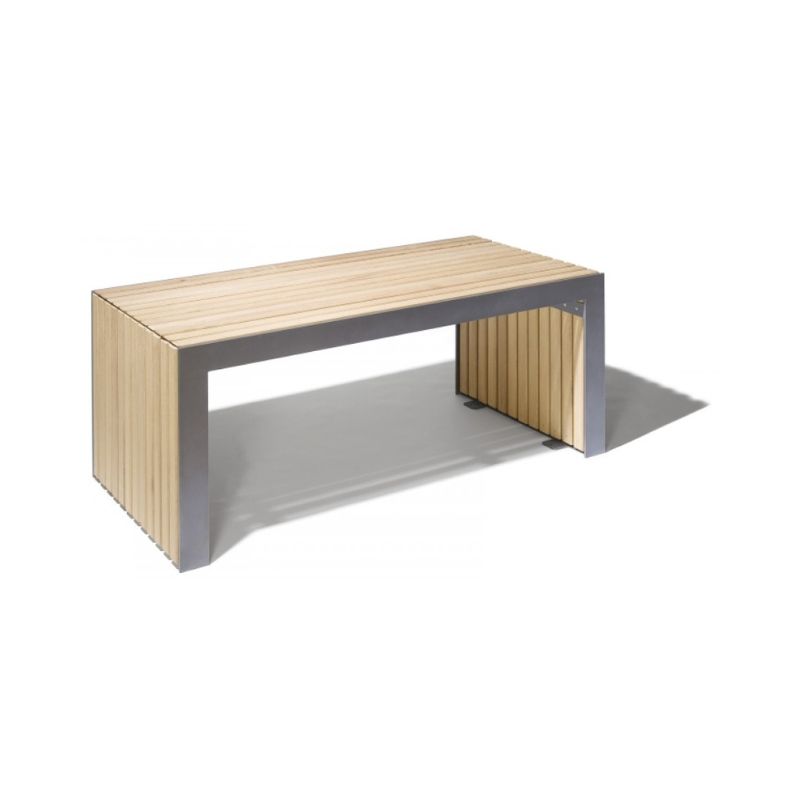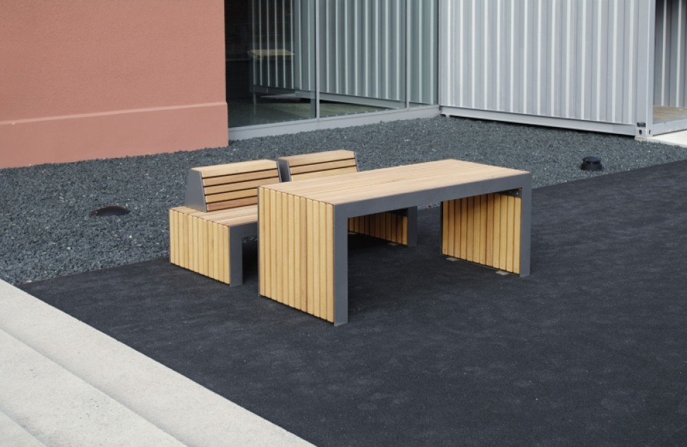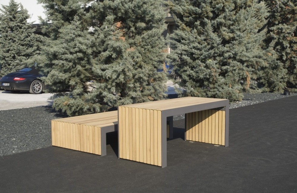 La table Plaza se compose d’un mélange de bois exotique FCS non traité et d’une structure en acier galvanisé teinté d’un gris métallisé DB 703 (équivalent au RAL 7016). Ce mélange apporte une touche de modernité qui séduira sans aucun doute vos usagers.